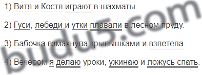 Составь и запиши предложения, в которых есть: 1) два однородных подлежащих при одном сказуемом; 2) три однородных подлежащих при одном сказуемом; 3) два однородных сказуемых при одном подлежащем; 4) три однородных сказуемых при одном подлежащем. Расставь правильно знаки препинания. Подчеркни орфограммы.