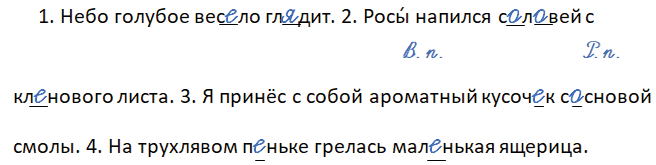 1. Небо (И. п.) голубое (И. п.) весело глядит. 2. Росы́ напился соловей с кленового (Р. п.) листа (Р. п.). 3. Я принёс с собой ароматный (В. п.) кусочек (В. п.) сосновой (Р. п.) смолы (Р. п.). 4. На трухлявом (П. п.) пеньке (П. п.) грелась маленькая (И. п.) ящерица (И. п.).