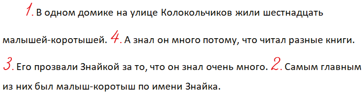 (1) В одном домике на улице Колокольчиков жили шестнадцать малышей-коротышек. (4) А знал он много потому, что читал разные книги. (3) Его прозвали Знайкой за то, что он знал очень много. (2) Самым главным из них был малыш-коротыш по имени Знайка.