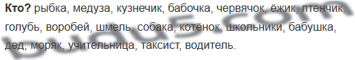 1. Перечисли одушевлённые существительные, обозначающие предметы, которые можно увидеть в воде, траве, на улице.