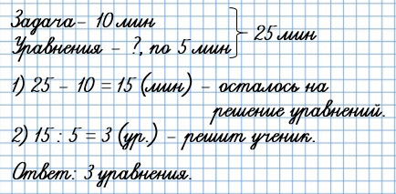 3. На решение задачи и уравнений ученик затратил 25 мин. Сколько уравнений он решил, если на решение задачи он затратил 10 мин, а на решение каждого уравнения - по 5 мин?