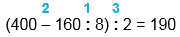 1) 160 : 8 = 20 2) 400 - 20 = 380 3) 380 : 2 = 190 |