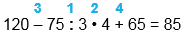 | 120 - 75 : 3 • 4 + 65 = 85 |