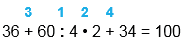 | 36 + 60 : 4 • 2 + 34 = 100 |