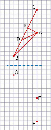 Чтобы построить треугольник, симметричный треугольнику АВС, сначала строим точки Р, О и Е, симметричные точкам соответственно точкам А, В и С (от оси симметрии (голубая пунктирная прямая) до симметричных точек вверх и вниз должно быть одинаковое количество клеточек)