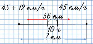 7. От двух станций, расстояние между которыми 56 км, отошли одновременно в противоположных направлениях два поезда. Скорость одного поезда 45 км/ч, а скорость другого на 12 км/ч больше. Какое расстояние будет между этими поездами через 3 ч? через 10 ч?