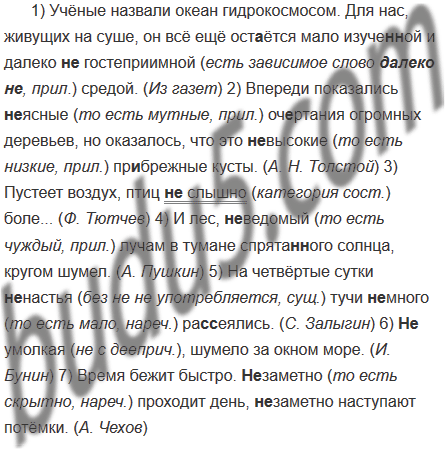 1) Учёные назвали океан гидрокосмосом. Для нас живущих на суше он всё ещё остаётся мало изуче(н, нн)ой и далеко (не)гостеприимной средой. (Из газет) 2) Впереди показались (не)ясные оч..ртания огромных деревьев но оказалось что это (не)высокие пр..брежные кусты. (А. Н. Толстой) 3) Пустеет воздух птиц (не)слышно боле... (Ф. Тютчев) 4) И лес (не)ведомый лучам в тумане спрята(н, нн)ого солнца кругом шумел. (А. Пушкин) 5) На четвёртые сутки (не)настья тучи (не)много ра(с, сс)еялись. (С. Залыгин) 6) (Не)умолкая шумело за окном море. (И. Бунин) 7) Время бежит быстро. (Не)заметно проходит день (не)заметно наступают потёмки. (А. Чехов)