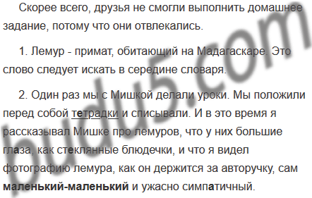 Один раз мы с Мишкой делали уроки. Мы положили перед собой т..традки и списывали. И в это время я рассказывал Мишке про лемуров, что у них большие гл..за, как стеклянные блюдечки, и что я видел фотографию лемура, как он держится за авторучку, сам маленький-маленький и ужасно симп. .тичный.