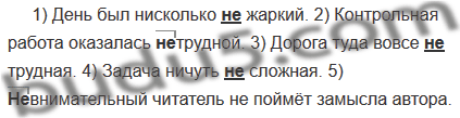1) День был нисколько (не)жаркий. 2) Контрольная работа оказалась (не)трудной. 3) Дорога туда вовсе (не)трудная. 4) Задача ничуть (не)сложная. 5) (Не)внимательный читатель не поймёт замысла автора.