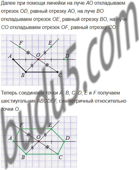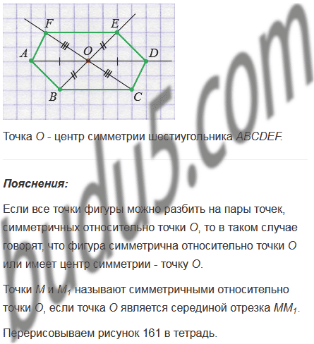 На рисунке161 изображены стороны АВ и ВС и центр симметрии О шестиугольника АВСDЕF. Перерисуйте рисунок в тетрадь и постройте шестиугольник АВСDЕF.