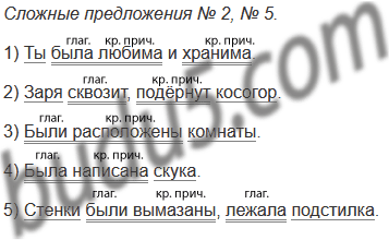 1) Нами ты была любима и для милого хранима. (А. Пушкин) 2) Заря сквозит оттенком алым, / Подёрнут блеском небывалым / Покрытый снегом косогор (А. Фет) 3) На южной стороне дома были расположены комнаты, натопленные и жилые. (Л. Толстой) 4) На людях и на животных была написана скука. (А. Чехов) 5) Внутри гнезда стенки были аккуратно вымазаны глиной, а на дне лежала мягкая подстилка. (Ю. Дмитриев)