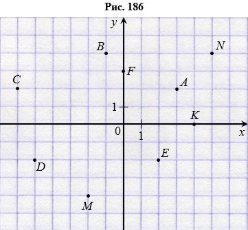 Найдите координаты точек А, В, С, D, Е, F, К, М, N, изображенных на рисунке 186.