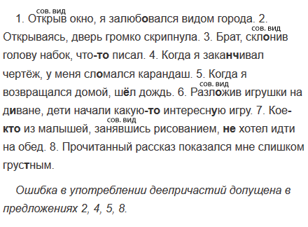 1. Открыв окно, я залюб..вался видом города. 2. Открывая дверь, она громко скрипнула. 3. Брат, скл..нив голову набок, что(то) писал. 4. Закан(?)чивая чертёж, у меня сл..мался карандаш. 5. Возвращаясь домой, ш..л дождь. 6. Разл..жив игрушки на д..ване, дети начали какую(то) интересн..ю игру. 7. Кое(кто) из малышей, занявшись рисованием, (не)хотел идти на обед. 8. Прочитав рассказ, он показался мне слишком грус(?)ным.