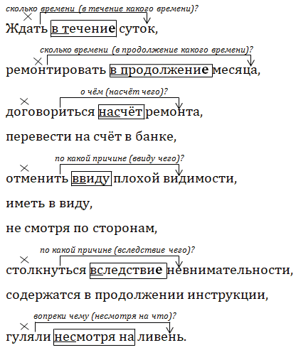 Ждать (в)течени.. суток, ремонтировать (в)продолжени.. месяца, договориться (на)счёт ремонта, перевести (на)счёт в банке, отменить (в)виду плохой видимост.., иметь (в)виду, (не)смотря по сторонам, столкнуться (в)следстви.. (не)внимательност.., содержатся (в)продолжени.. инструкци.., гуляли (не)смотря на ливень.