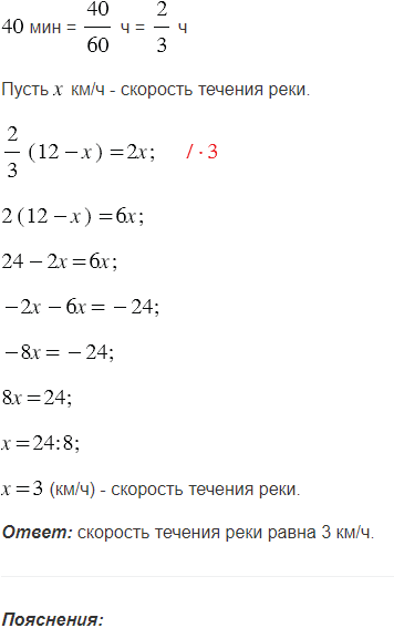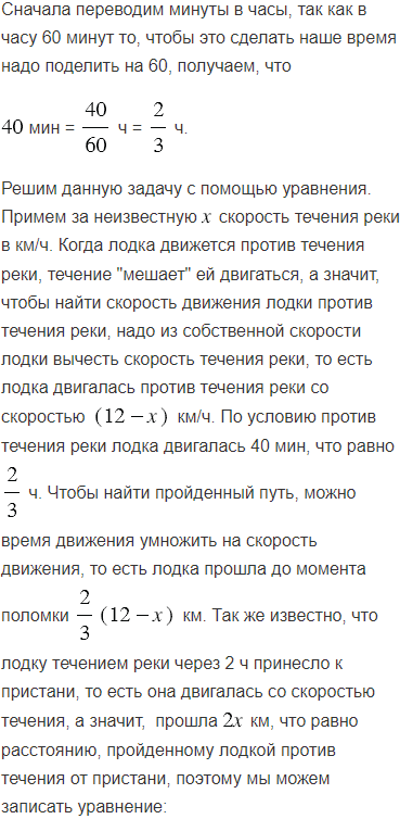От пристани против течения реки отплыла моторная лодка, собственная скорость равна 12км/ч. Через 40 мин после отправления лодки вышел из строя мотор, и лодку течением реки через 2 ч принесло к пристани. Какова скорость течения реки?