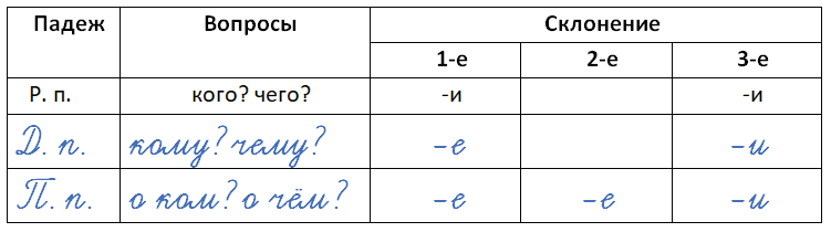 Вспомните: имена существительные какого склонения и в каких падежах имеют окончания -е и -и? Впишите в таблицу названия этих падежей, вопросы к ним и окончания -е и -и.
