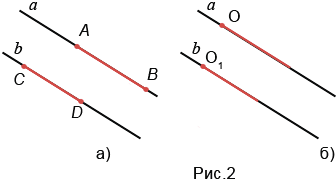 Если отрезки (лучи) лежат на параллельных прямых, то их называют параллельными отрезками (лучами) (рис. 2 а, б).